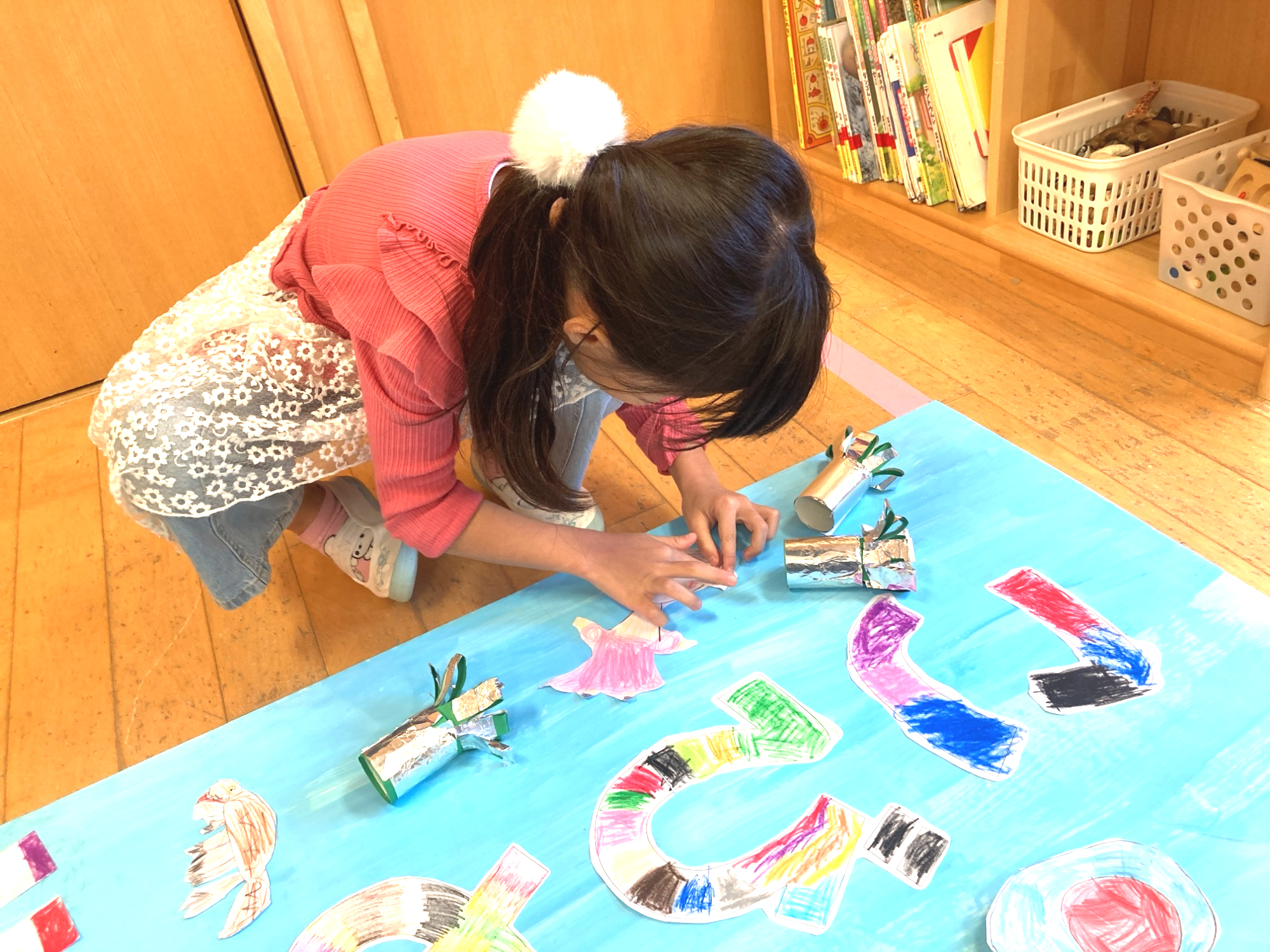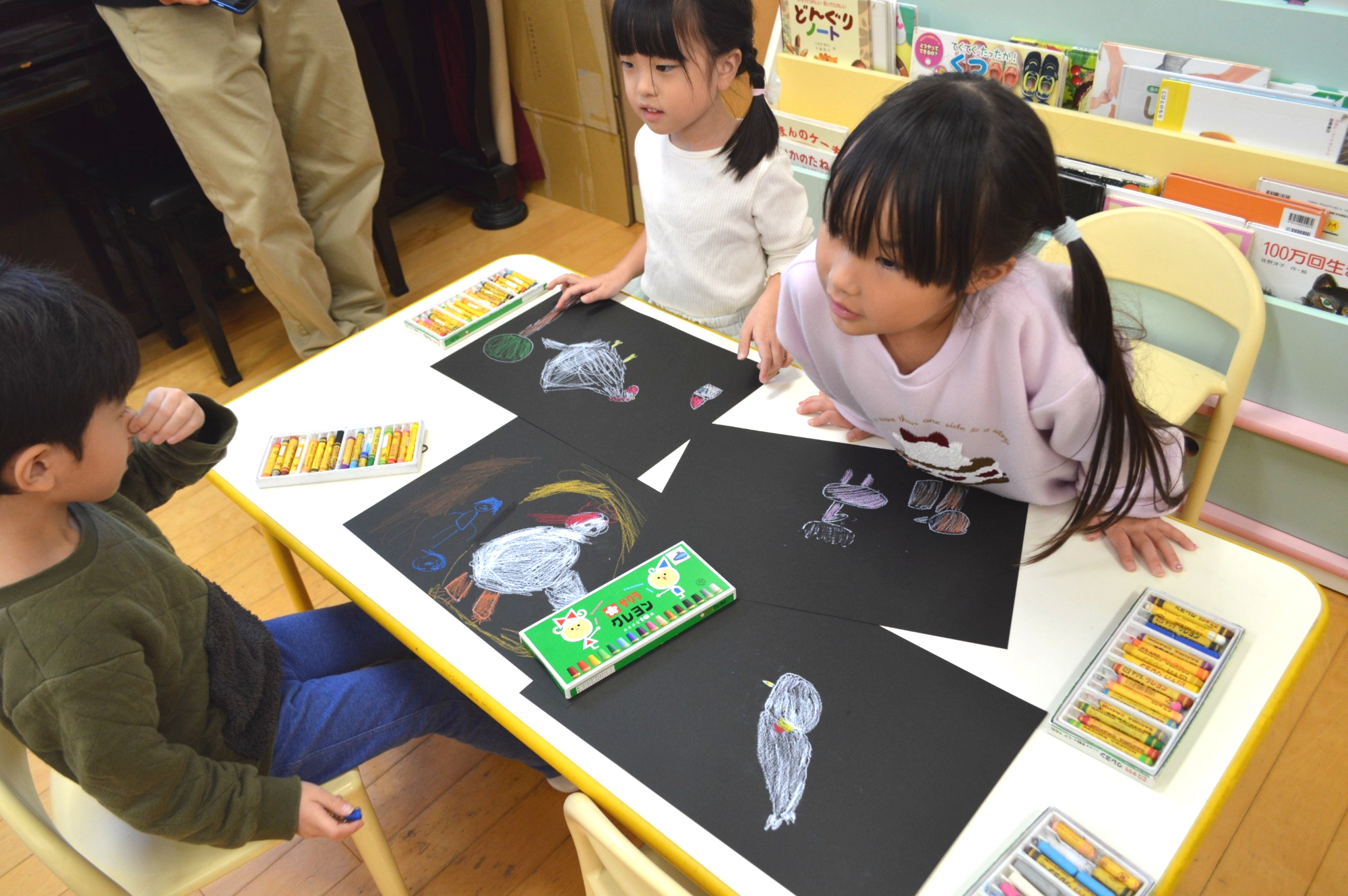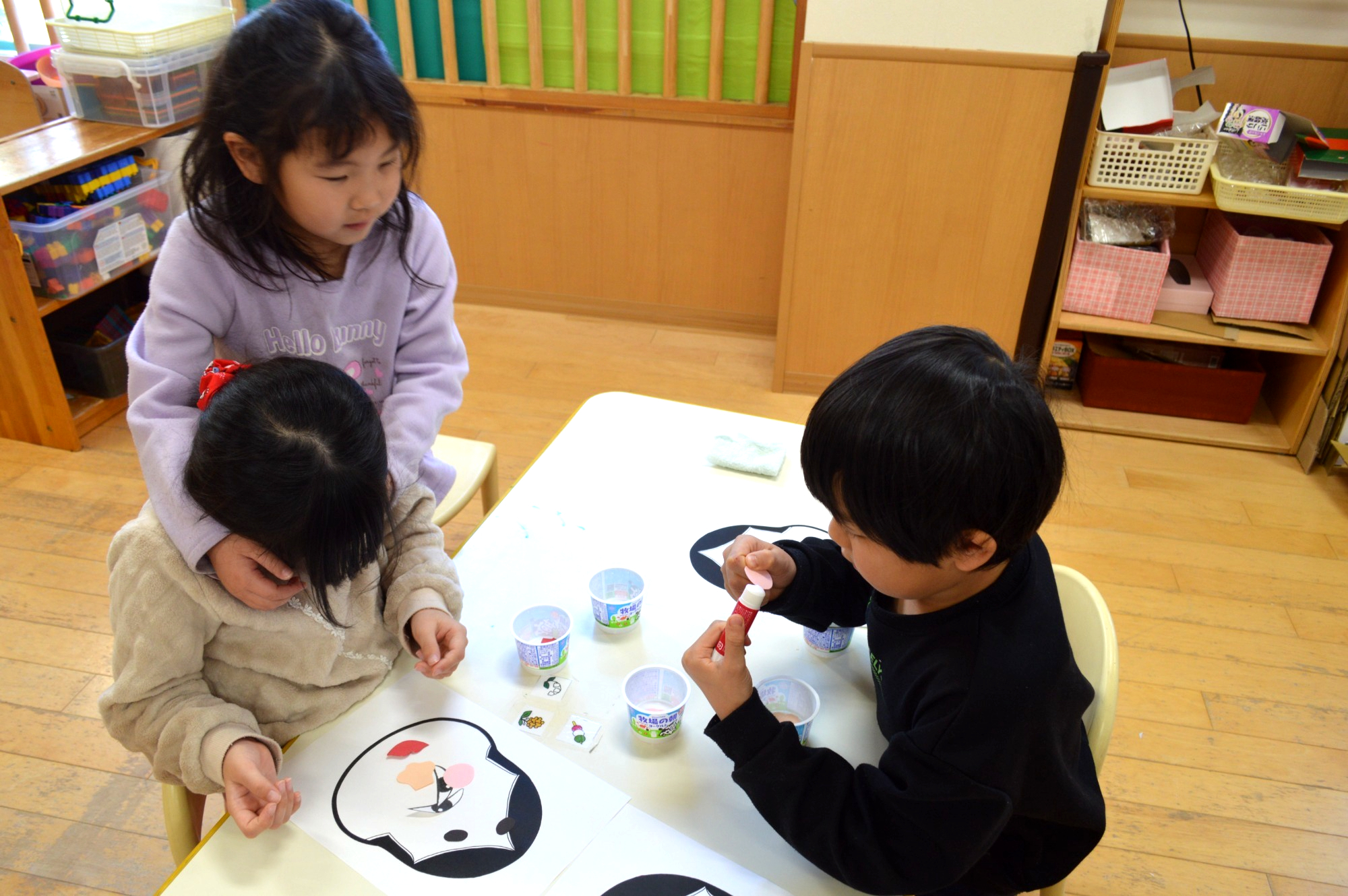 各グループに分かれて、お正月あそびをします。こちらのグループは『ふくわらい』。目隠しをする子、顔のパーツに糊を貼って渡す子、顔を仕上げる子に分かれてあそびます。