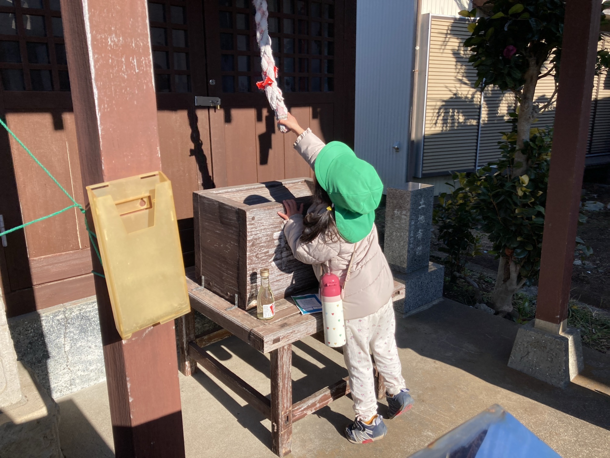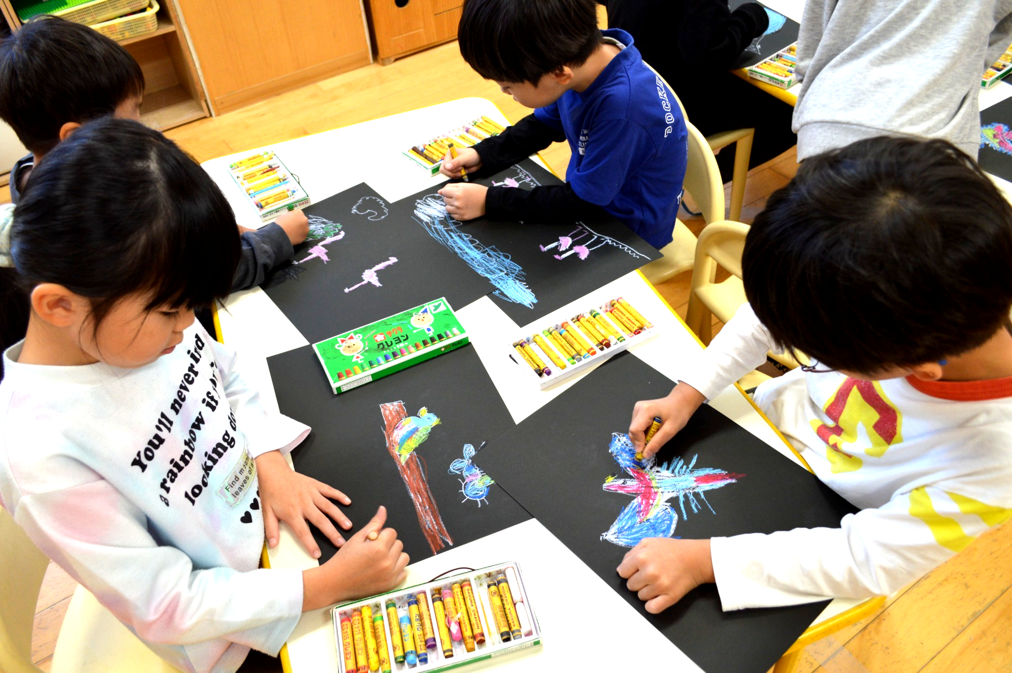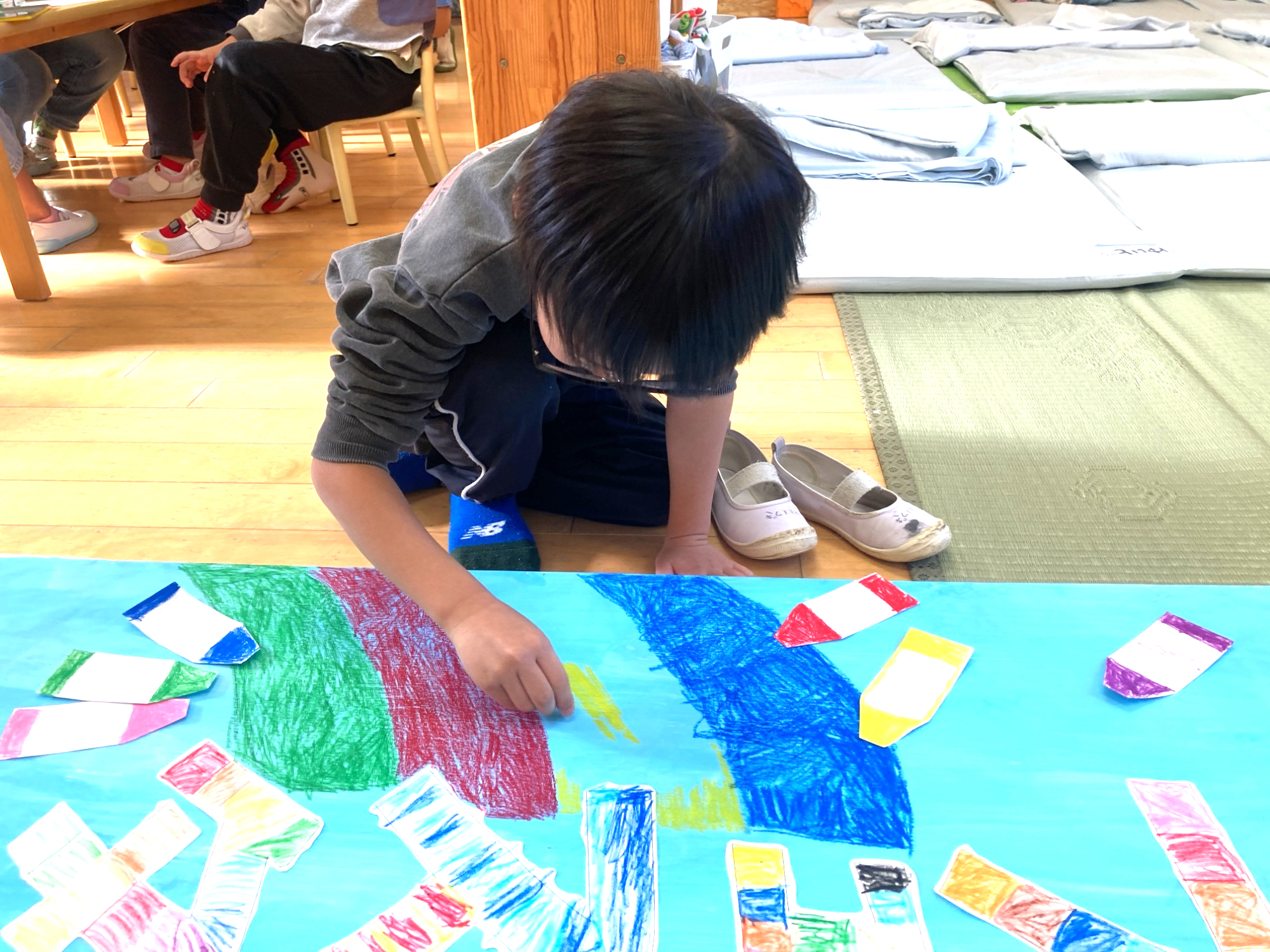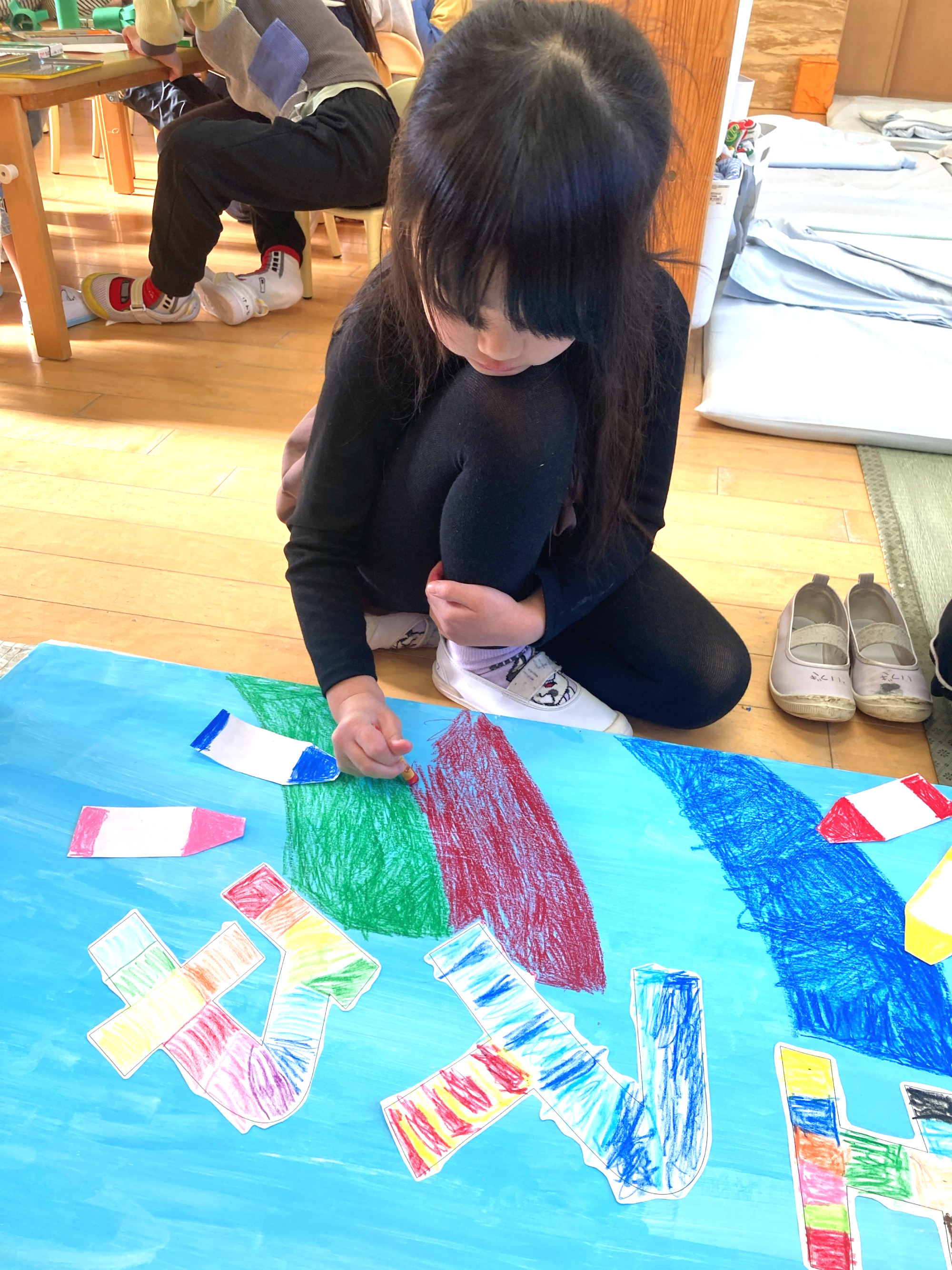各グループに分かれて、お正月あそびをします。こちらのグループは『ふくわらい』。目隠しをする子、顔のパーツに糊を貼って渡す子、顔を仕上げる子に分かれてあそびます。