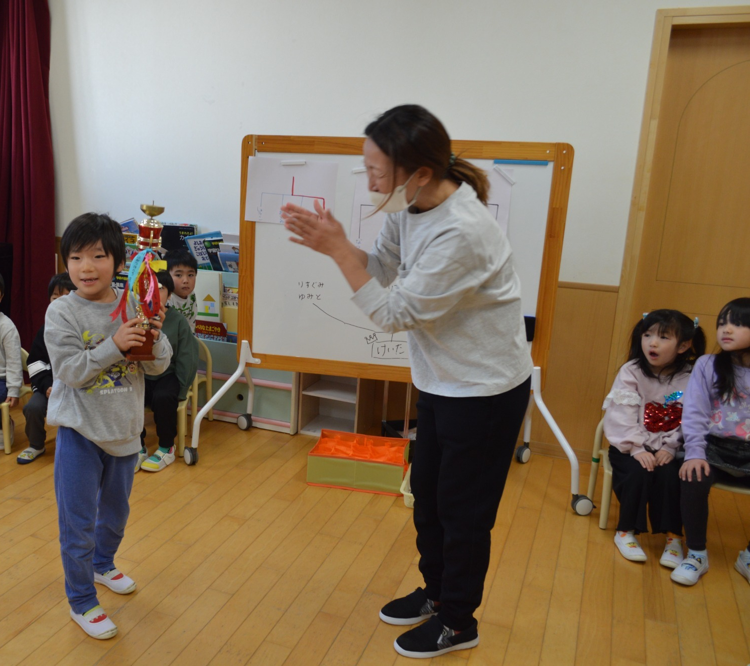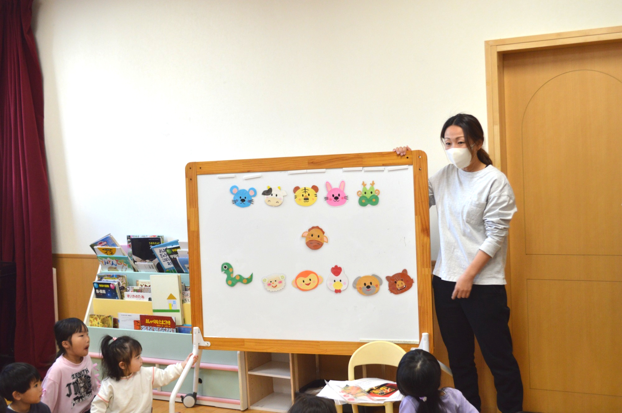 今日は3~5歳の異年齢“きょうだいグループ”で新年子ども会です。はじめに十二支のお話を聞きました。