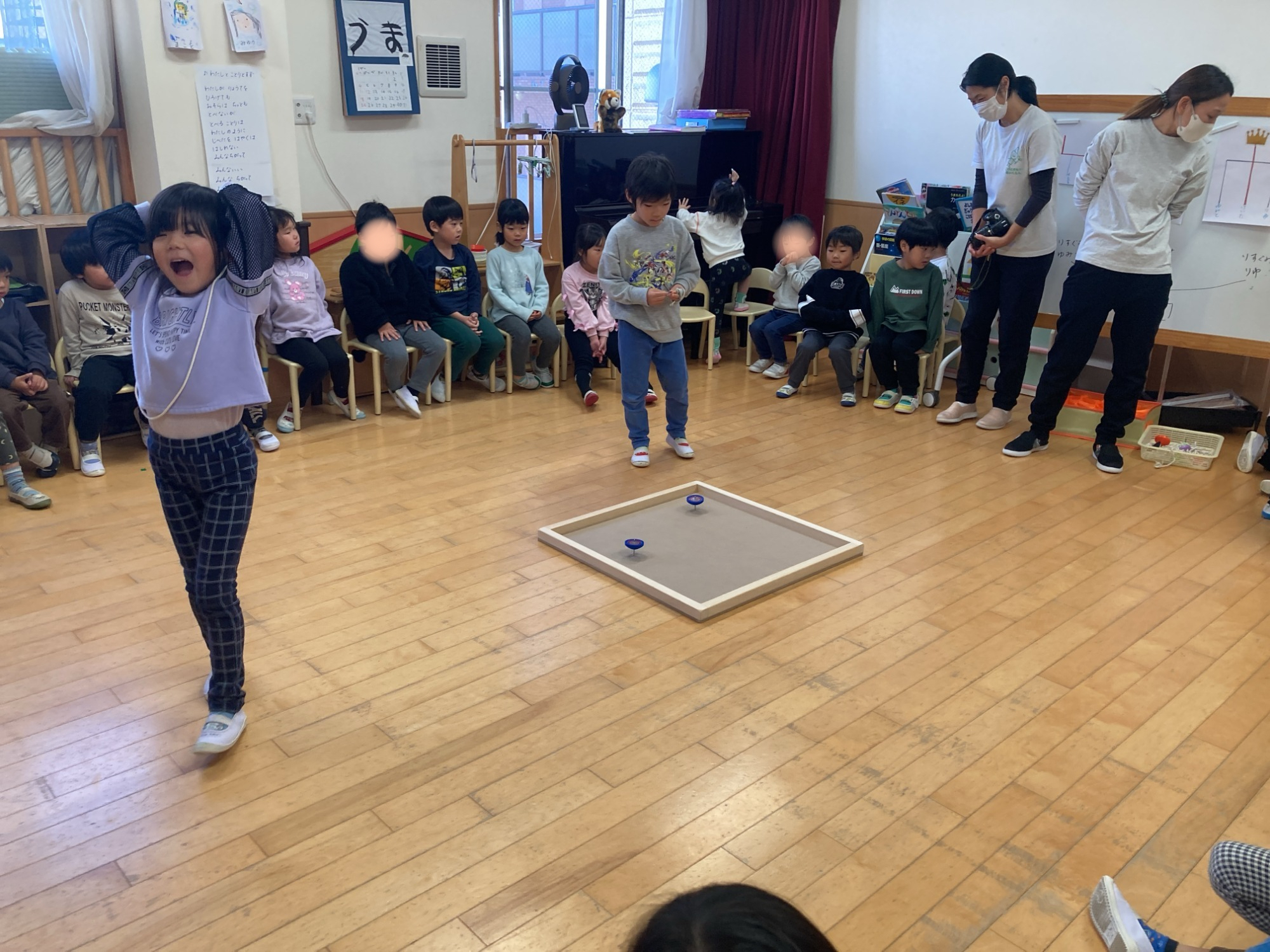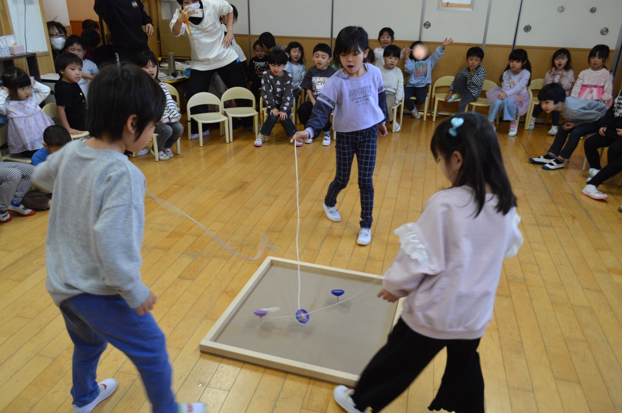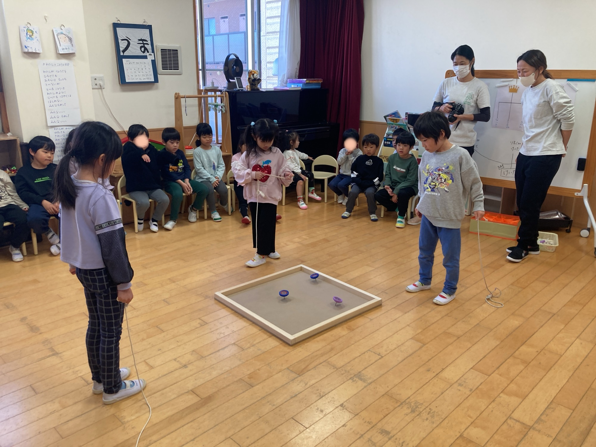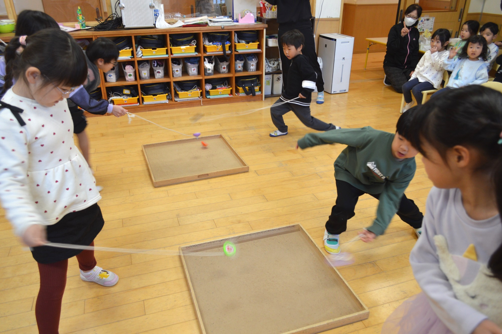 こちらのチームは“紐ゴマ対決”。トーナメントで優勝者を決めます。